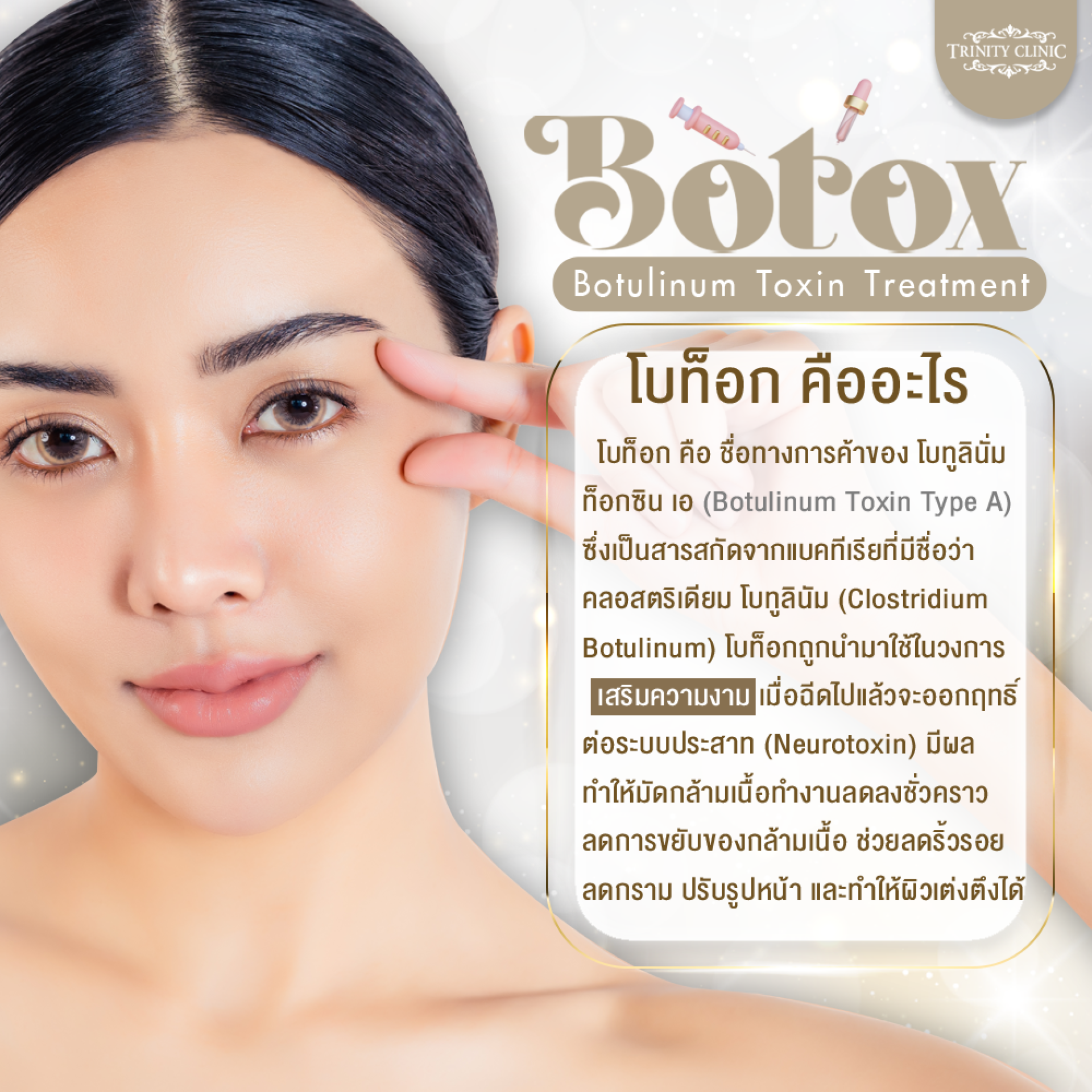 เสริมความงาม เมื่อฉีดไปแล้วจะออกฤทธิ์ ต่อระบบประสาท (Neurotoxin) มีผลทำให้มัดกล้ามเนื้อทำงานลดลงชั่วคราว ลดการขยับของกล้ามเนื้อ ช่วยลดริ้วรอย ลดกราม ปรับรูปหน้า และทำให้ผิวเต่งตึงได้