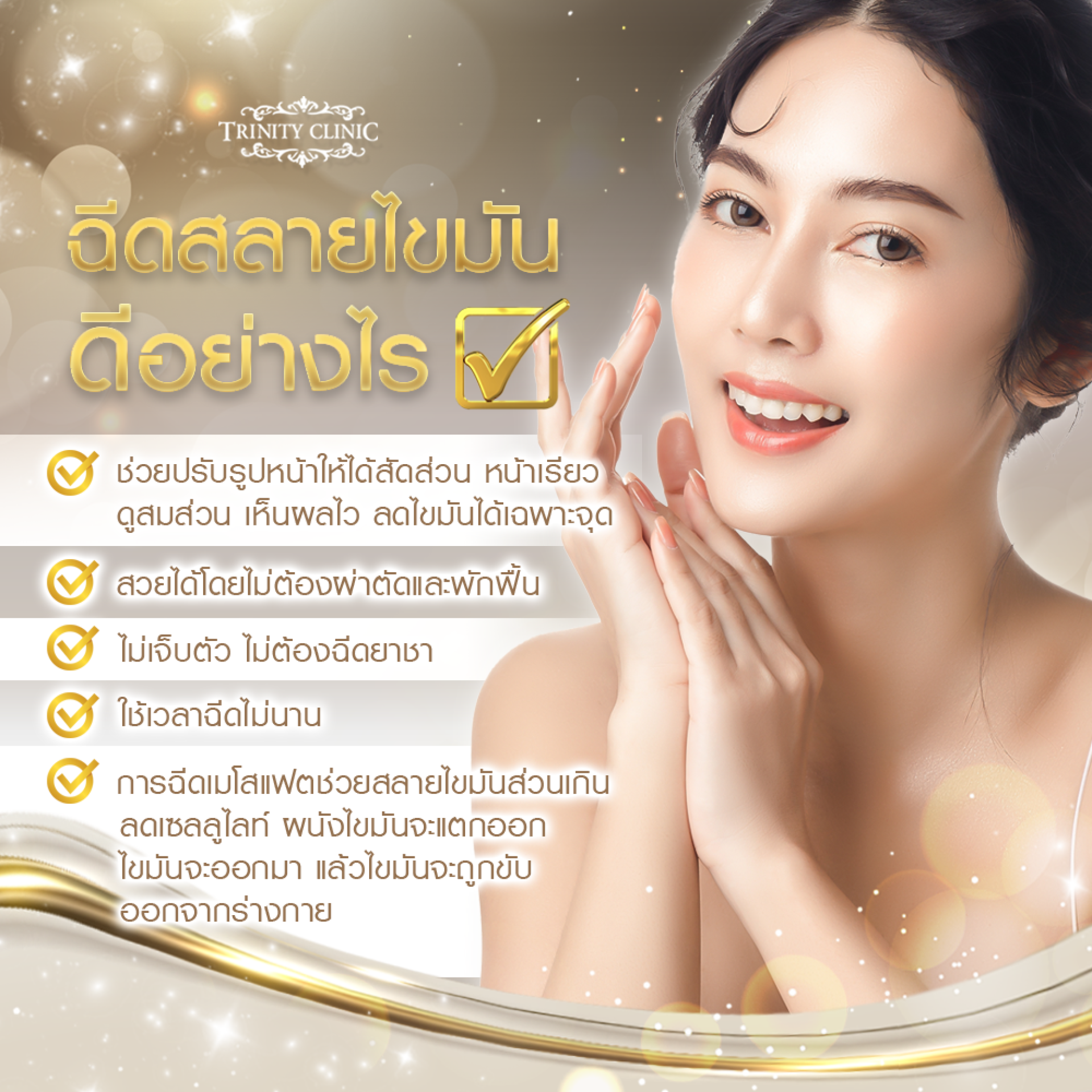 - การฉีดเมโสแฟตช่วยสลายไขมันส่วนเกินลดเซลลูไลท์ ผนังไขมันจะแตกออกไขมันจะออกมา แล้วไขมันจะถูกขับออกจากร่างกาย